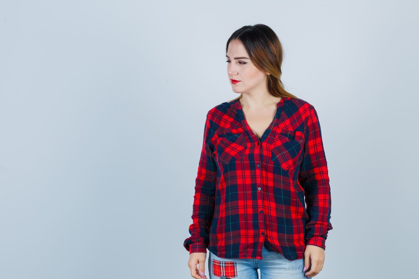 young-lady-checked-shirt-looking-away-looking-thoughtful-front-view